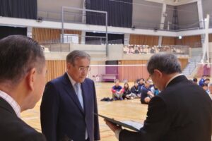 今回の開催にあたって、長い間東京ミニバレー協会の顧問として支えてくださっている元東京都議会議員の鈴木隆道先生に全日本ミニバレー協会会長の小島秀俊氏より表彰がされました。お忙しいスケジュールの中でもミニバレーの行事に数多くご参加され(大きな試合はすべて参加されてると思います)、私たちミニバレー愛好家に「ミニバレーはであい、ふれあい、わかちあいをモットーとする他に類を見ない素晴らしいスポーツ」だから「精一杯楽しんでください」と全員に愛情いっぱいのお言葉をくださっています。私たちの感謝の気持ちは表彰だけでは表せないほどです。鈴木先生、いつも本当にありがとうございます。