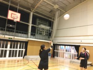 はじめは、パスの練習から。ミニバレーはバレーボールと異なり、片手でパスをする方がコントロールがつきやすいです。
